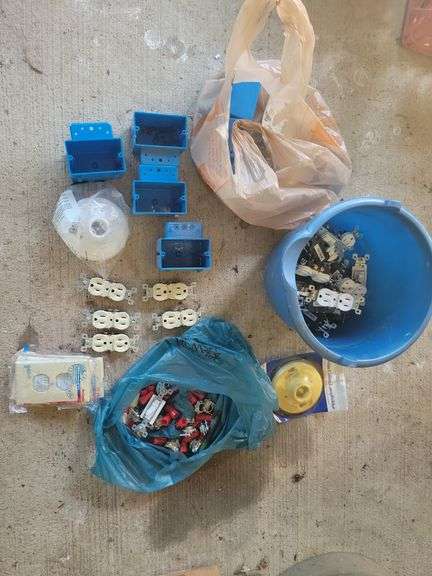 LOT 623 - Bucket of Electrical Plugs, Boxes, Hardware