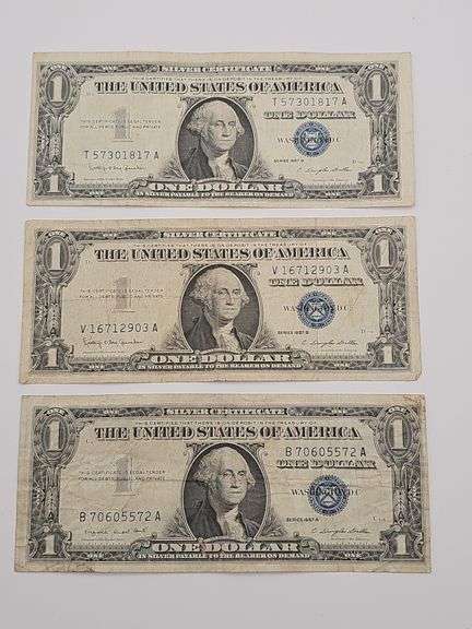 LOT 114 - 3- Blue Seal $1 Silver Certificates 1957 A & B