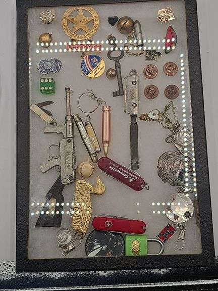 LOT 370 - Display Box of Knives, Key Rings, Pins & Misc